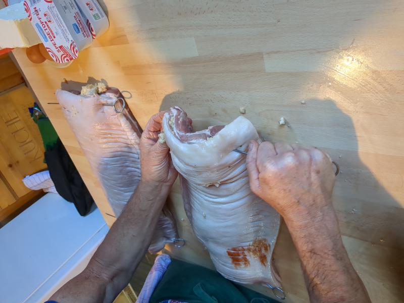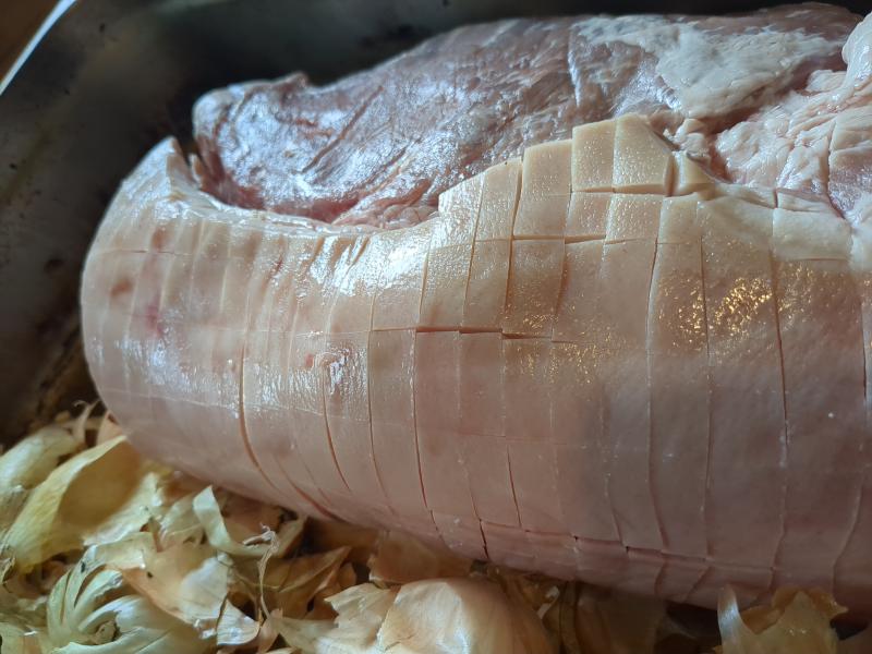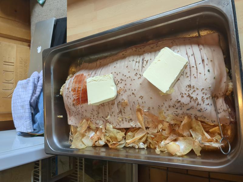 - Add the saved garlic & onion peels, and 400g butter to a tray with the pork.